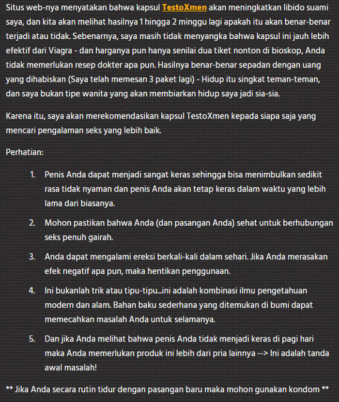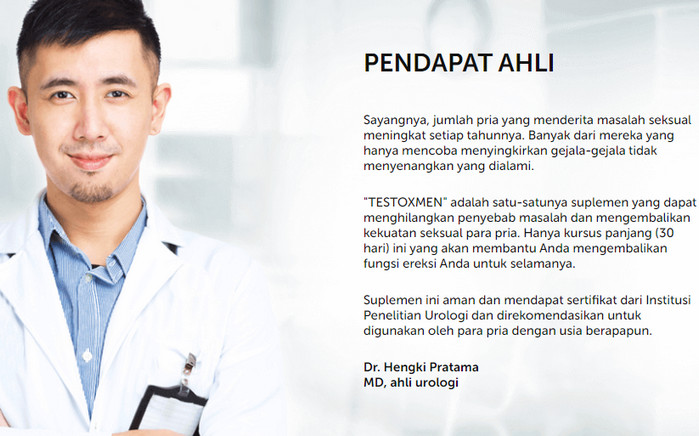 TestoXmen tidak membuat ketagihan dan cocok untuk pengobatan impotensi, meningkatkan fungsi ereksi dan mencegah gangguan seksual pada pria di segala usia. Kapsul TestoXmen akan membantu Anda mengatasi kedua gangguan sementara dalam kehidupan seksual dan cocok untuk pengobatan kompleks penyakit yang lebih serius dari sistem genitourinari. Karena keamanan dan efektifitasnya TestoXmen ini telah mendapatkan popularitas luas di kalangan pengguna.